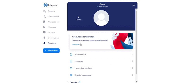 2. Перейдите в маркетплейс — раздел «Профиль» — нажмите на баннер «Станьте исполнителем».
